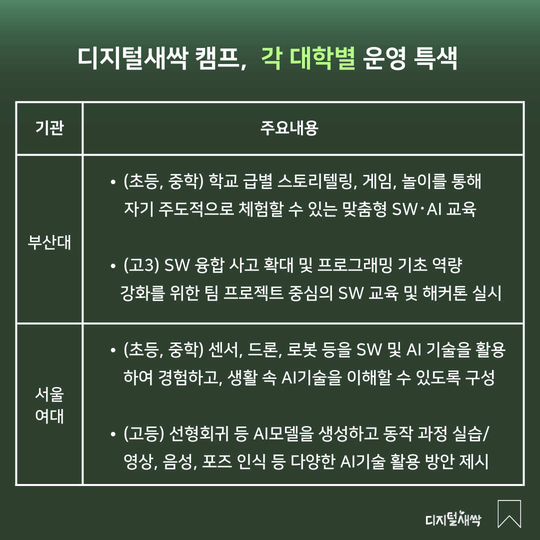 교육부와 17개 시·도교육청, 한국과학창의재단은 학생들이 겨울방학 동안 소프트웨어(Software)& 인공지능(AI) 분야를 접하고 배울 수 있도록 각 대학 및 기업과 협력하여 디지털새싹 캠프를 개최합니다.