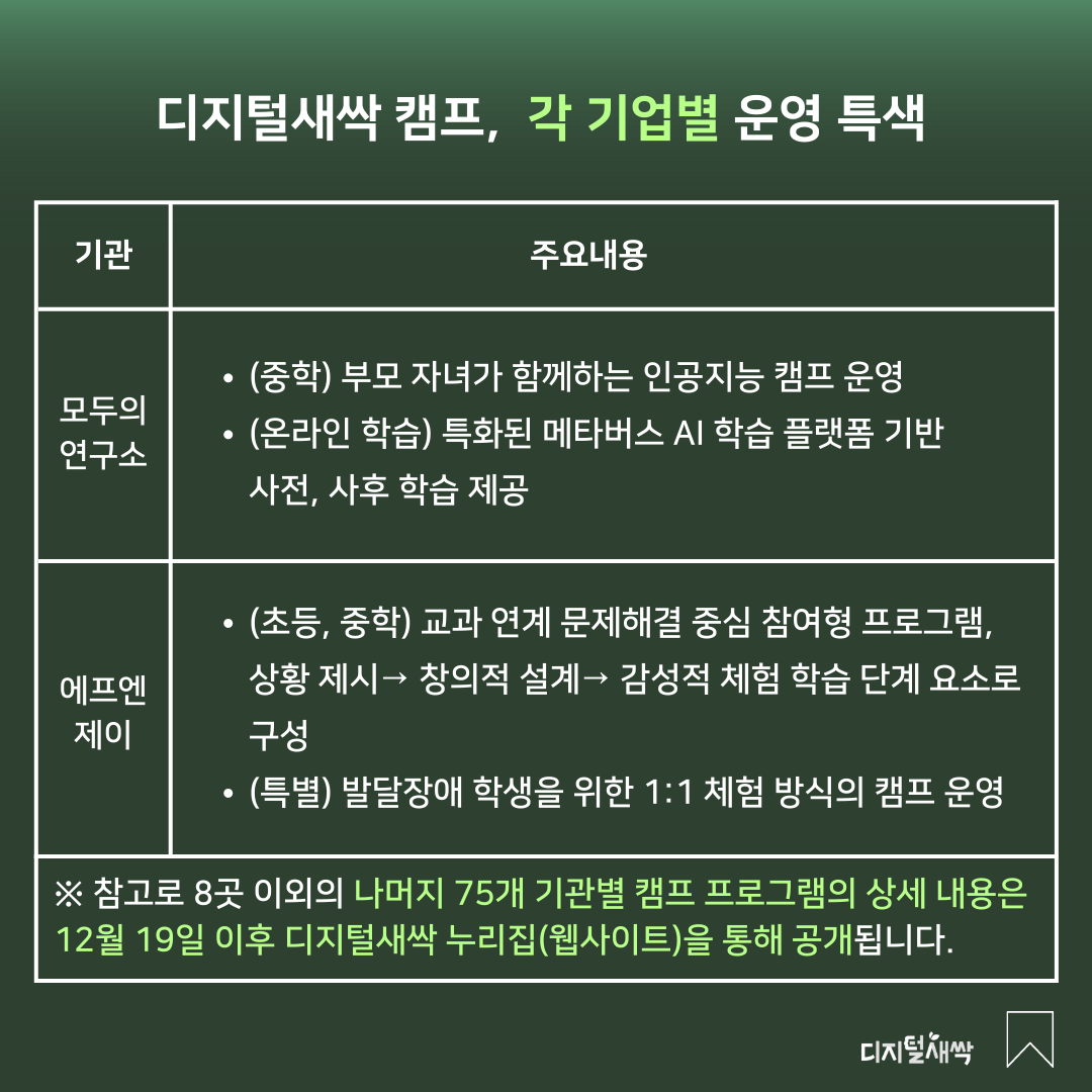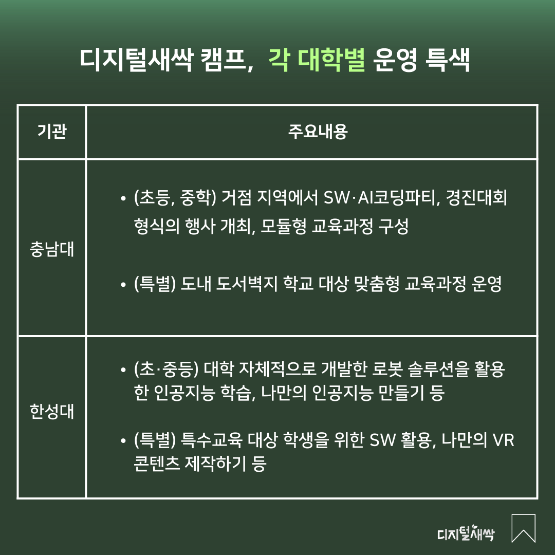 그렇다면 구체적으로 어떤 대학과 기업이 디지털새싹 캠프 운영 기관으로 선정되었는지 알아볼까요?